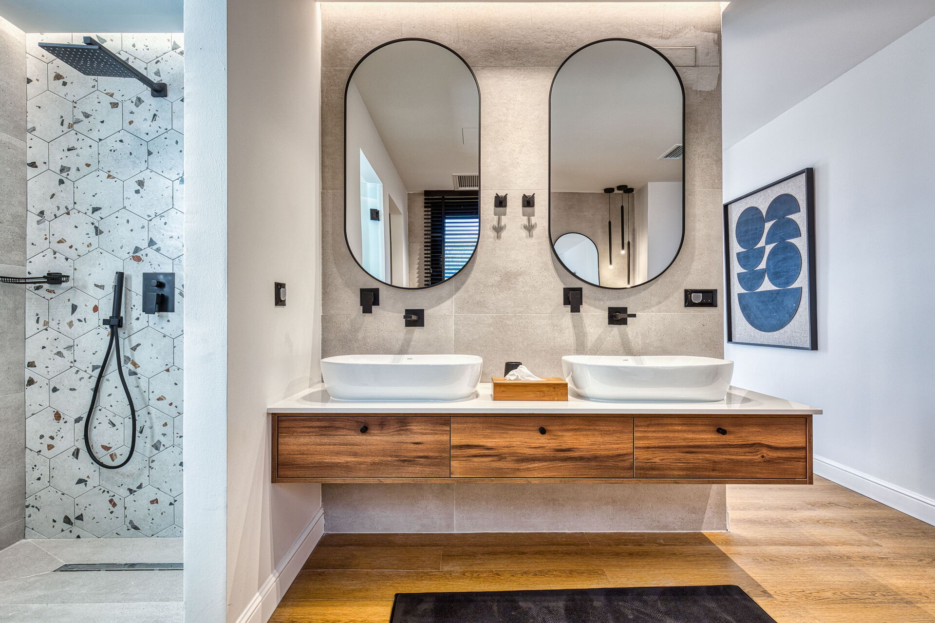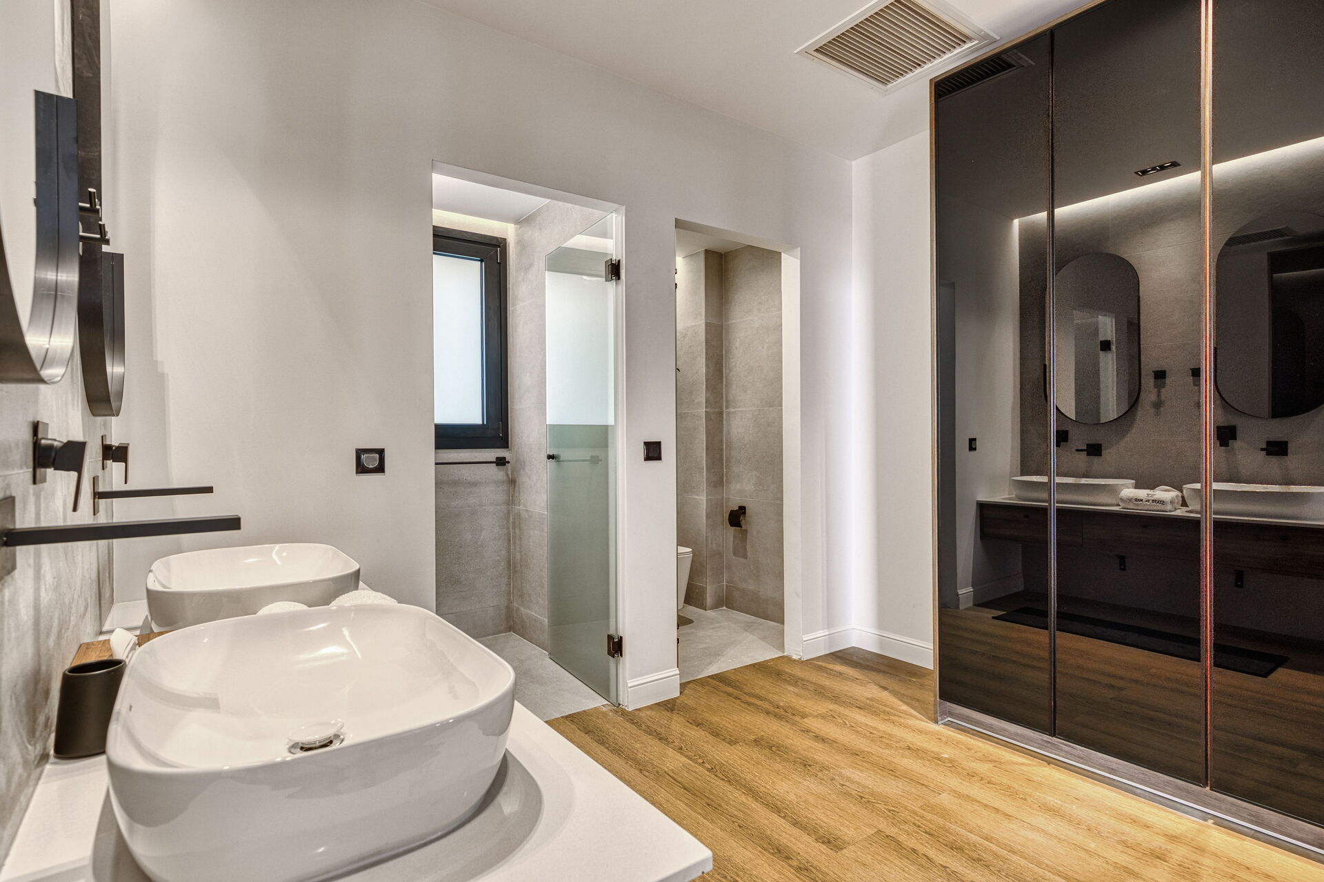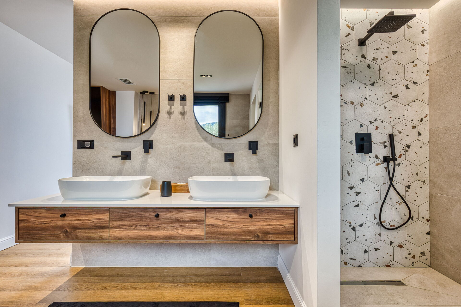 First floor: 2 double bedrooms, each with a private bathroom with shower, double bedroom with private bathroom with shower.