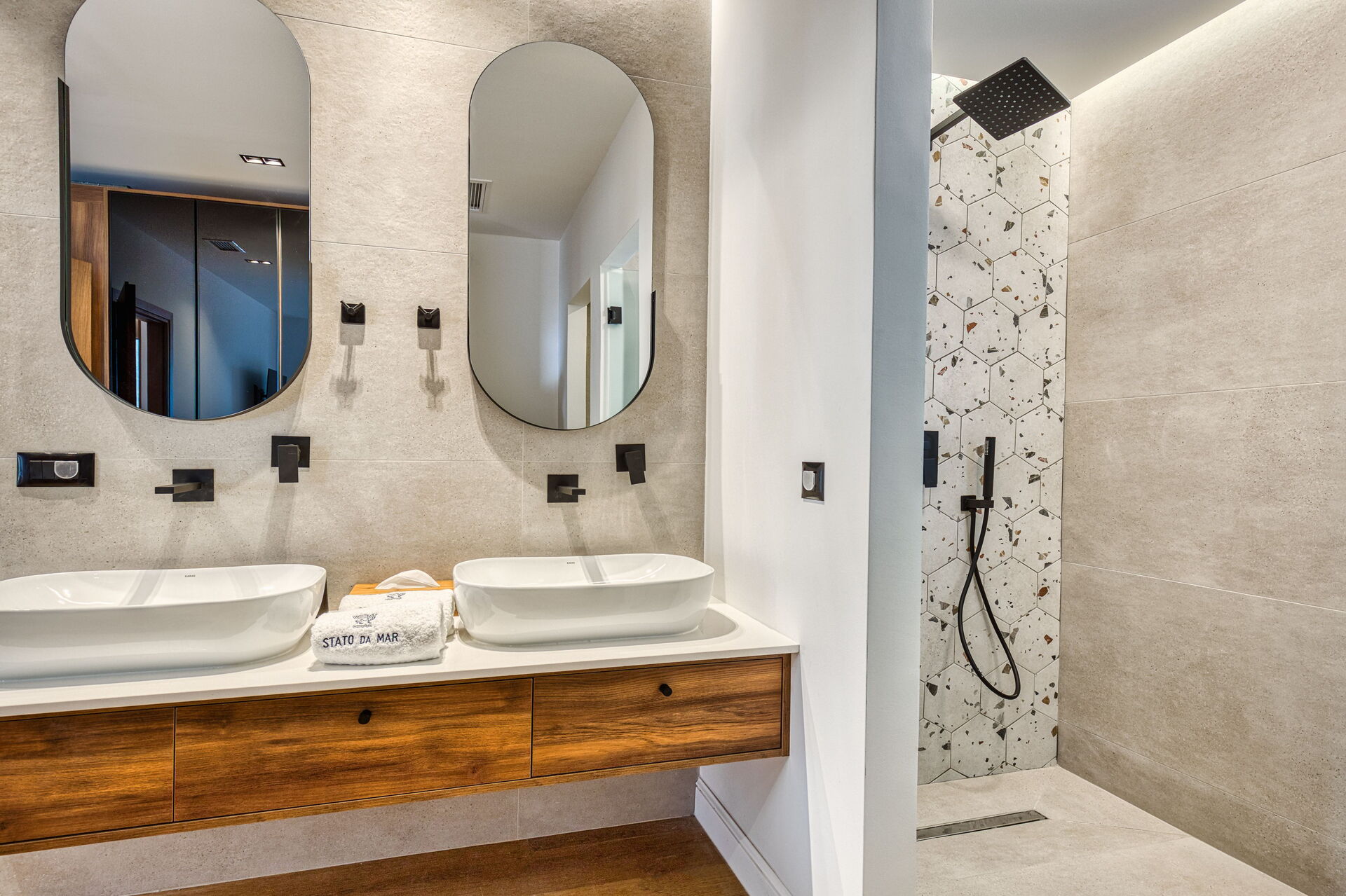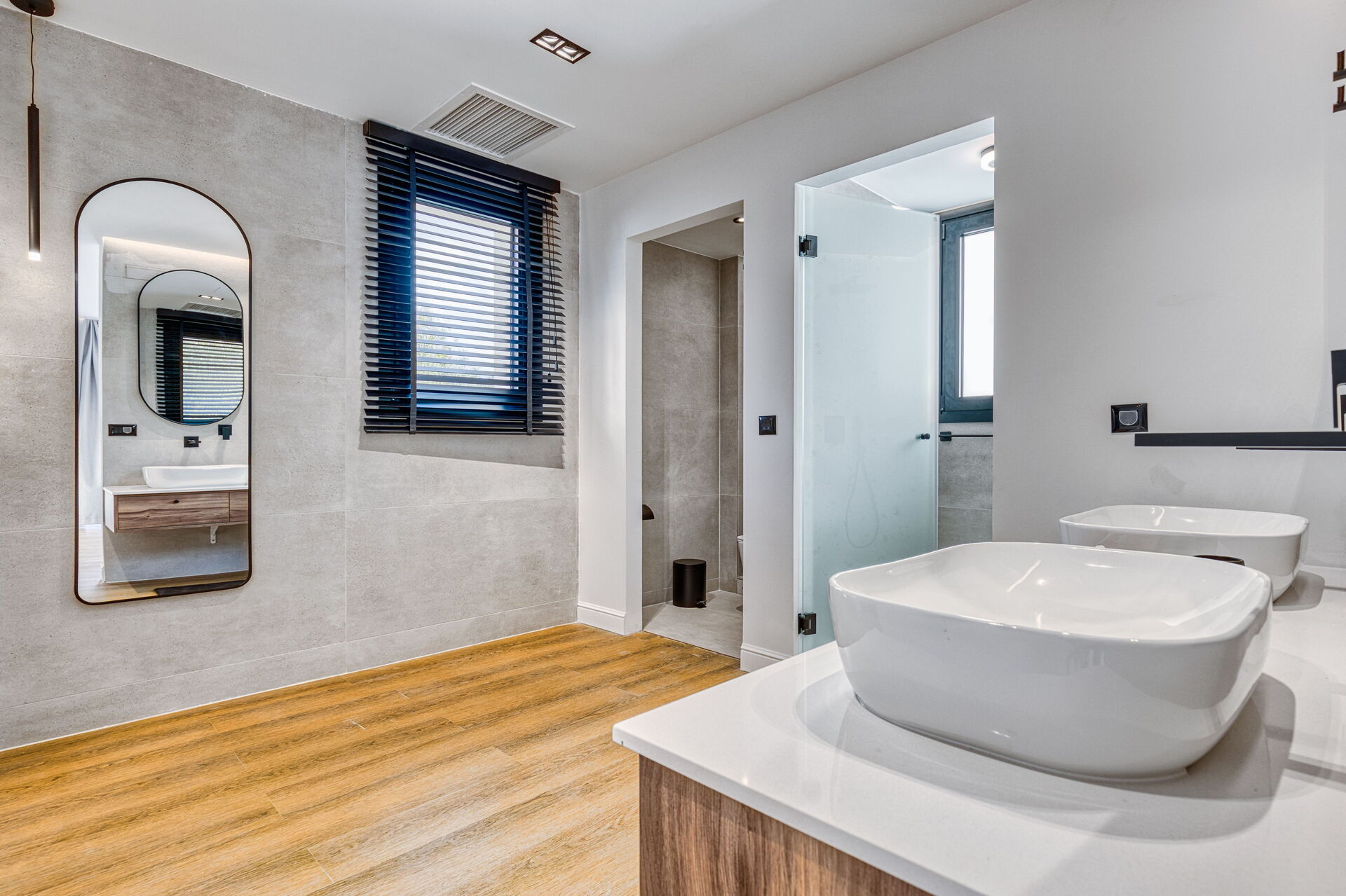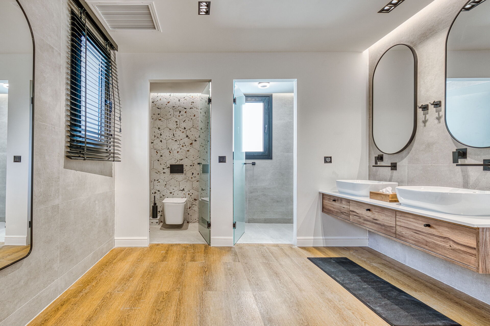 First floor: 2 double bedrooms, each with a private bathroom with shower, double bedroom with private bathroom with shower.
