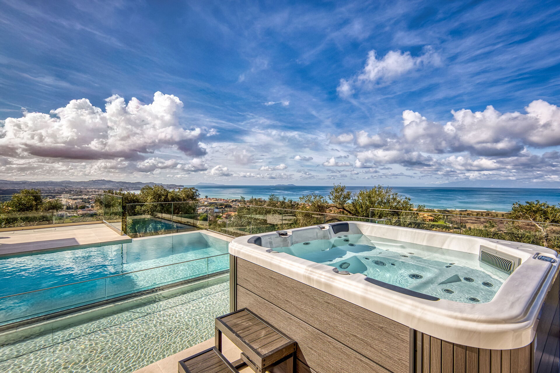 At the disposal of this vacation villa’s guests: private pool (9 x 5 meters, depth: 1,30 meters) with a separate part for small children (depth: 0,40 meters); panoramic views; outdoor Jacuzzi, 4 bedrooms, each with a private bathroom; close to the sea and to the town of Acharavi, where there are shops of all kinds; washing machine/dryer